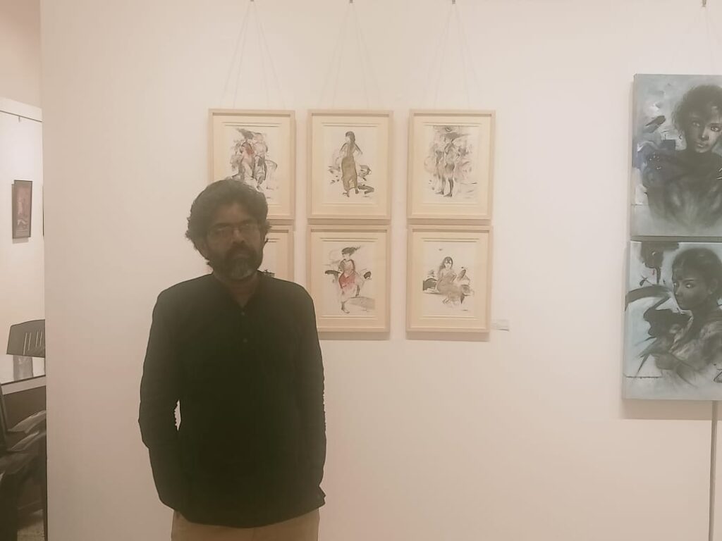 Hailing from the City of Dreams Kolkatta, he has redefined the rustic beauty of India and has given a new dimension to these paintings which have women in different role. Women empowered by making a presence in new roles without the earthen pots and having various form in the moon light and the Durga avatar. Making the ladies of bengal like our own Mamta Banerjee a role model for all of us.